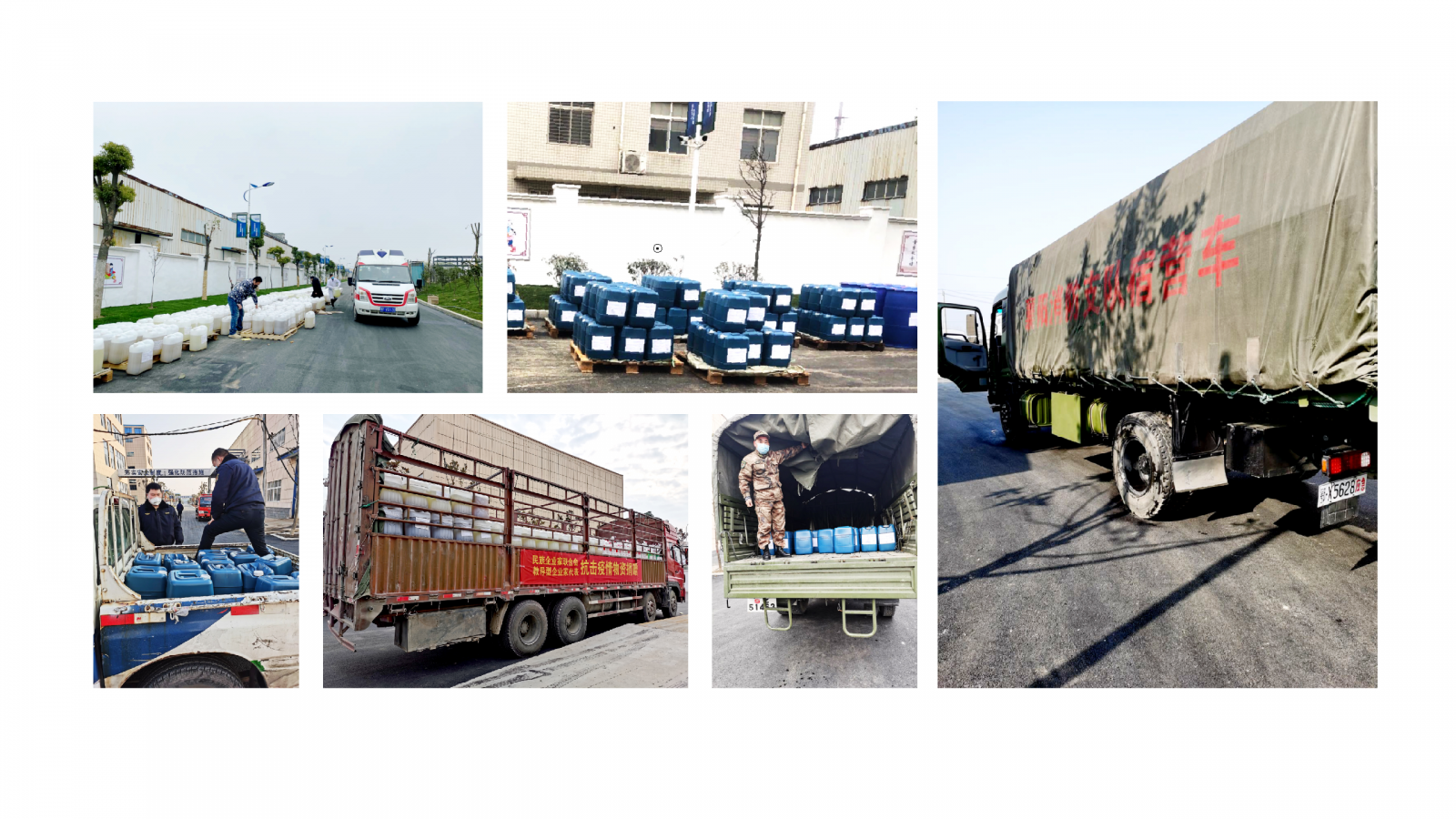 2020年年初新冠疫情全面爆發(fā),湖北又是全國(guó)的疫情中心。國(guó)難當(dāng)頭,董事長(zhǎng)帶領(lǐng)金達(dá)成部分領(lǐng)導(dǎo)主動(dòng)請(qǐng)纓,勇?lián)厝?,面臨種種困難,發(fā)揮黨員沖鋒在前、迎難而上的作風(fēng),生產(chǎn)84消毒液原液三百余噸,市值達(dá)四百萬,全部無償捐贈(zèng)給疫情最需要的地方。